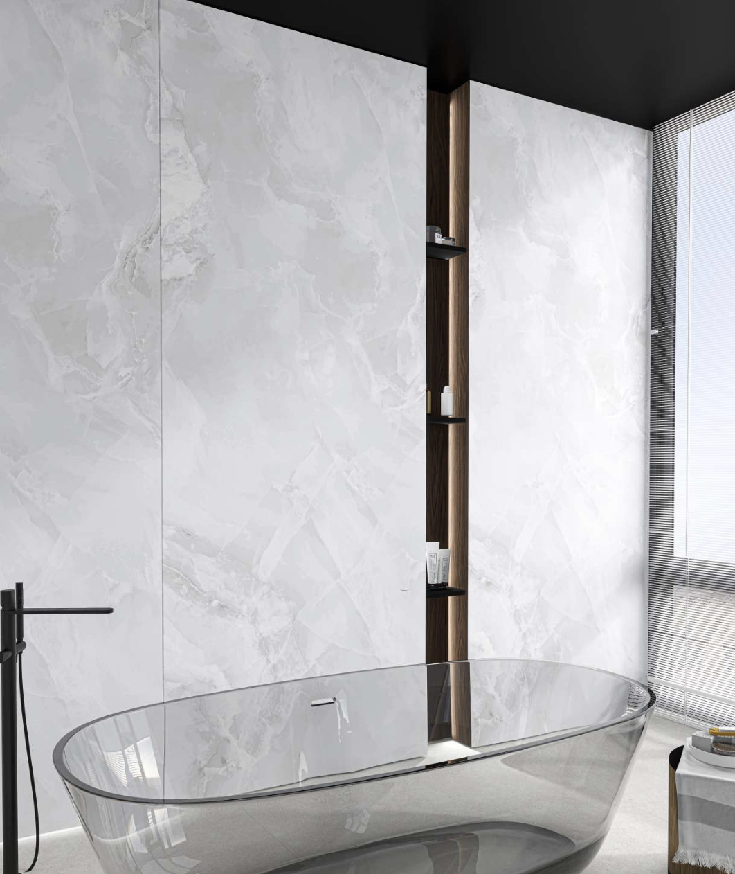 Tout d’abord, le format 120×240 blanc avec effet bookmatch attire immédiatement le regard. En effet, ses veines symétriques rappellent les marbres naturels haut de gamme. Cela crée un point focal parfait dans un salon, une salle de bain ou un hall d’entrée. De plus, ce format généreux permet de réduire le nombre de joints, ce qui renforce la fluidité visuelle de l’espace.